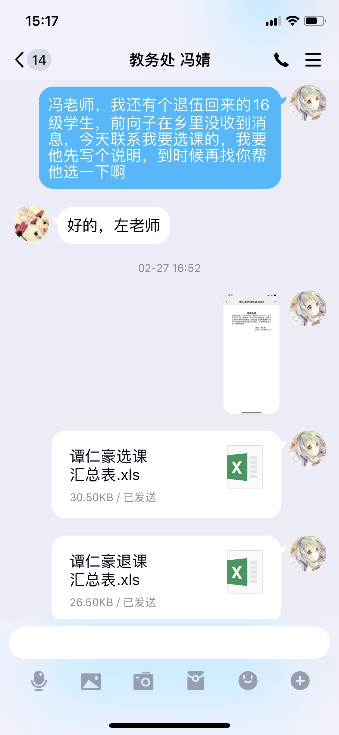 还有一名退伍回来复学的16级学生谭仁豪,之前因为在老家,不方便上网,错过了选课时间,在了解情况后,左老师找到教务处老师,帮他补选课,因为他选课学分已超过上限,普通物理A(1)和高等数学A(2)两门课程只能选一门,左老师跟学生再次沟通,因为下学期普通物理A(1)不会开课,建议他先选普通物理A(1),下学期再选高等数学A(2),这样下学期修完其他课程就可以毕业,不需要再耽误一学期。